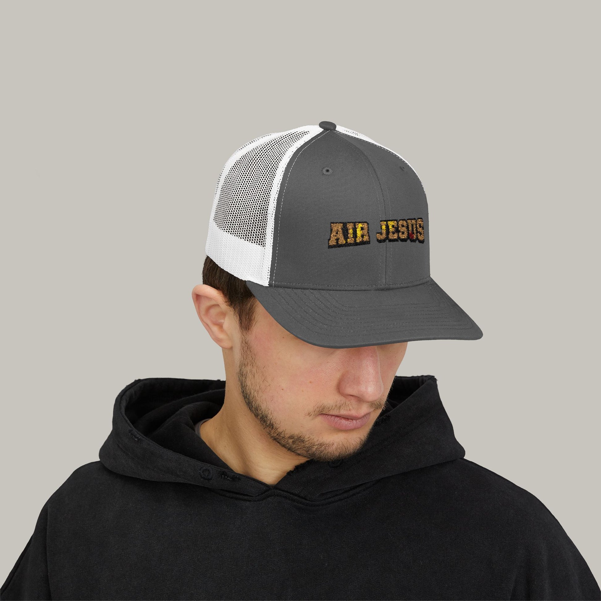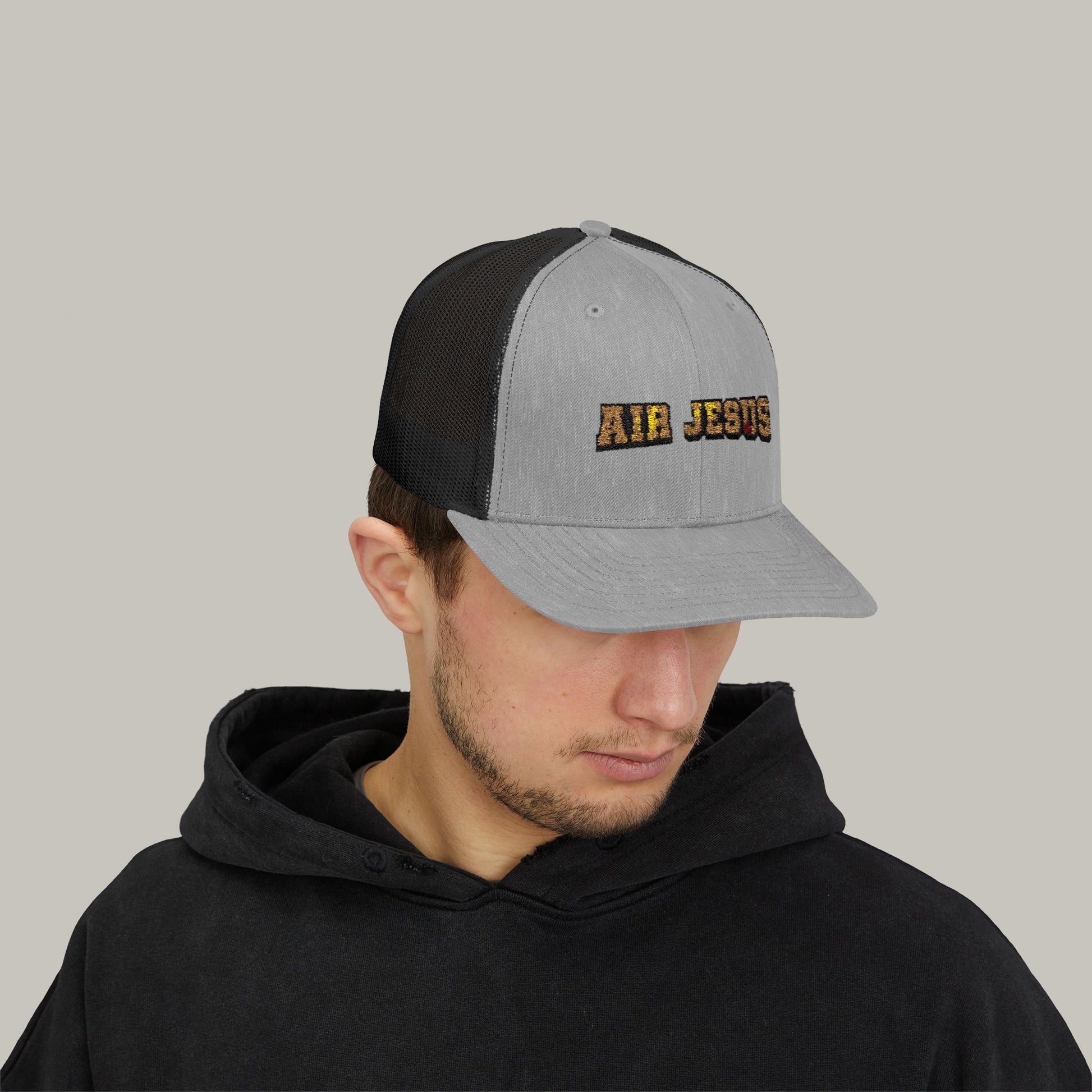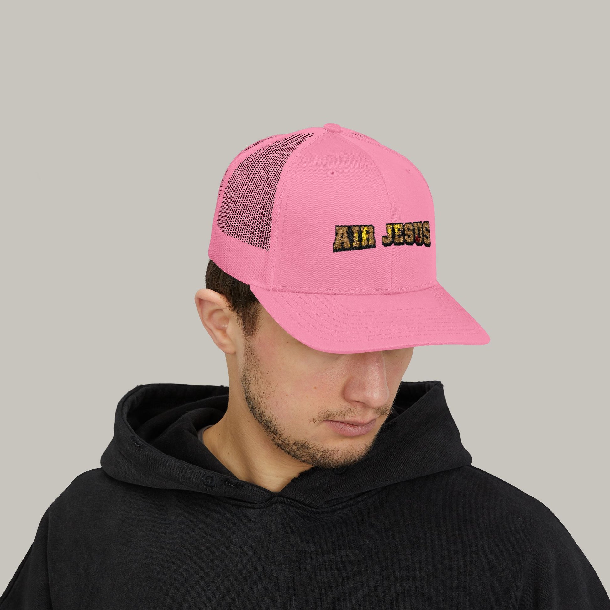 Classic trucker cap with the AirJesus logo embroidered on the front. Inside, a soft pattern of golden clouds reflects faith, clarity, and purpose. Made with breathable mesh panels and an adjustable back for a comfortable fit that carries quiet strength and style.